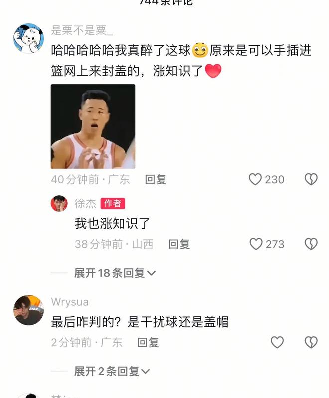 徐杰很少会在个人社交媒体公开表达对某位球员或者某支球队,又或者某位吹罚的不满,但广东与山西的比赛确实出现了很多争议判罚。在一个关于徐杰被盖帽的视频的评论区,徐杰罕见真人现身,直接吐槽了这次所谓的“盖帽”:“太牛了这球,挑战成功。”有网友揭示了这个“盖帽”的真相:“原来是可以手插进篮网上来封盖的,涨知识了。”徐杰则评论:“我也涨知识了。”