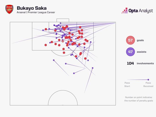 此役主场对阵布莱顿,萨卡在比赛第14分钟助攻厄德高破门,至此,萨卡英超生涯已直接参与104球,包括57球47助,据统计,萨卡超越皮雷,独占阿森纳队史英超参与进球榜第七。